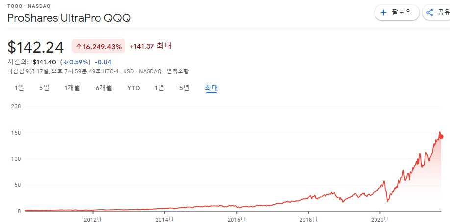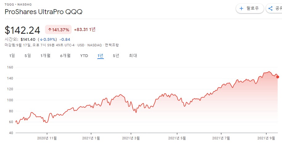 TQQQ ETF는 지난 1년 동안 +141.37% 오른 것을 확인할 수 있습니다.