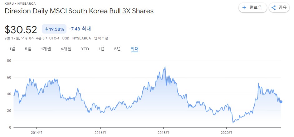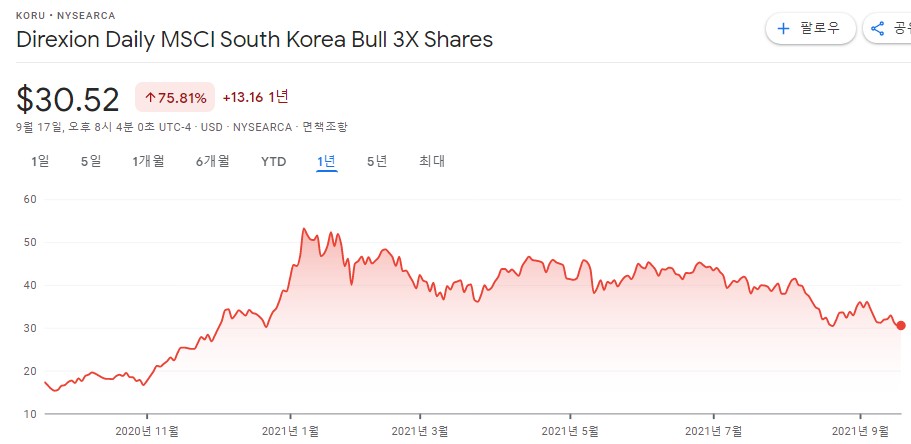 반면 다음은 KORU ETF의 지난 1년 차트입니다.