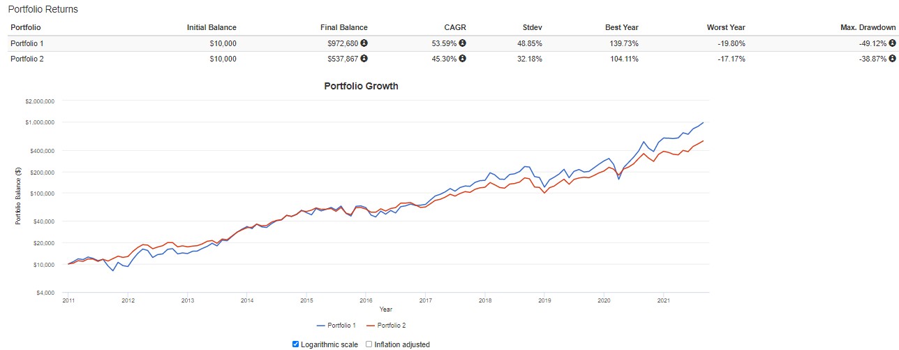 TQQQ가 생긴 2011년에 TQQQ에 만불($10,000)치 매수하고 오늘 계좌를 열어보았다면 투자금은 약 98배 가량 상승하여 98만불($980,000)이 찍혀있겠지만, 중간중간 MDD -50%는 여러번 겪어야 했습니다.